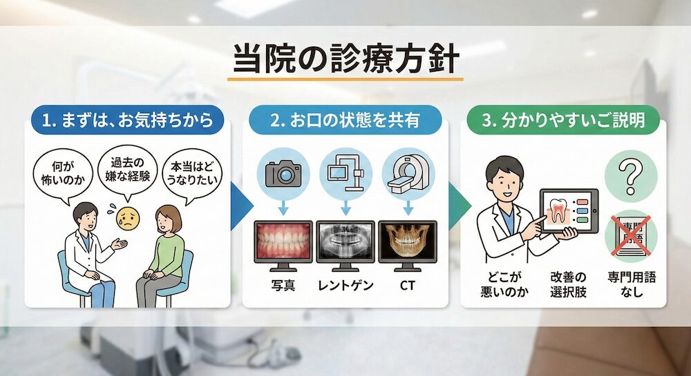 当院では、患者様が「わからない」状態をつくらず、一つ一つ丁寧に説明しながら進めることが、歯科恐怖症と向き合ううえでの最初の一歩だと考えています。