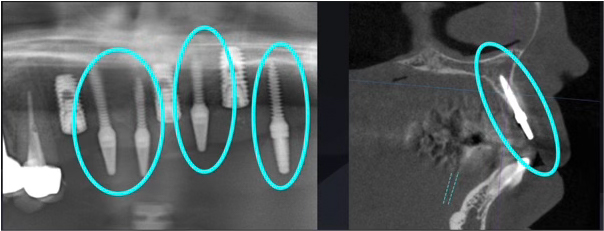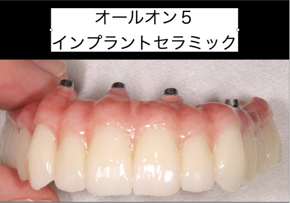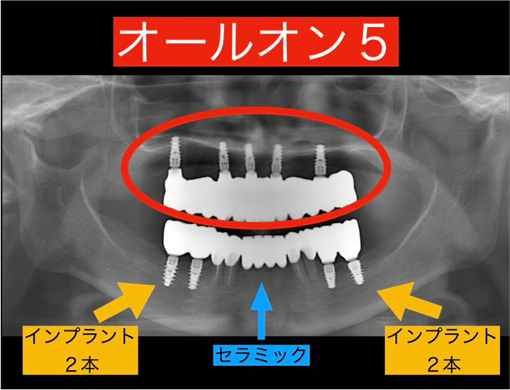 上の歯は大部分が保存困難だったため、5本のインプラントで全ての歯を支える『オールオン5』という方法を採用しました。オールオン4は4本のインプラントで支える方法のこと言います。