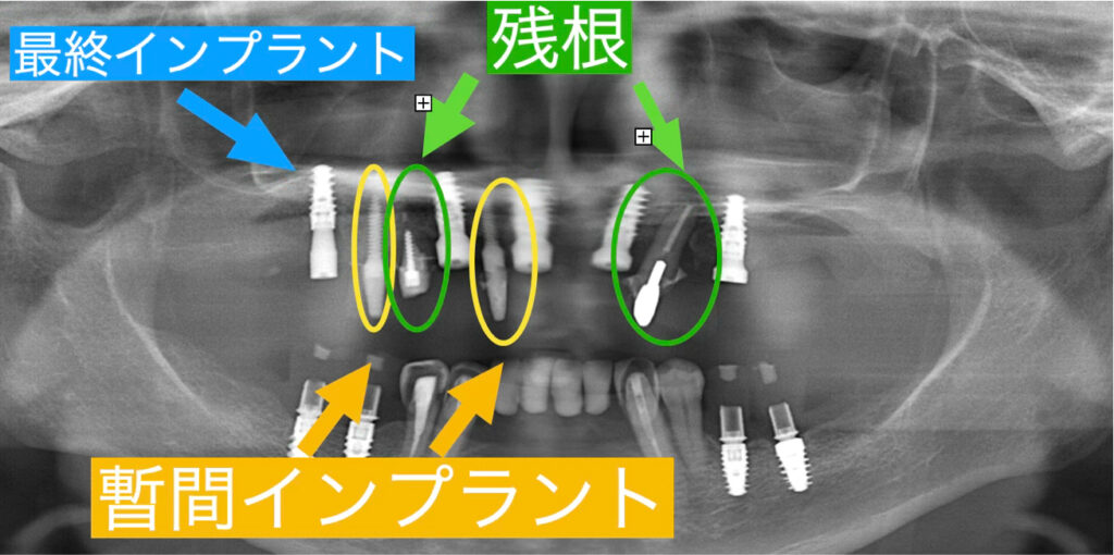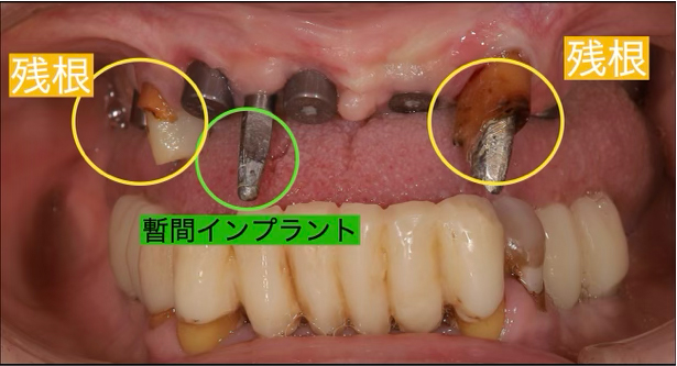 この期間を支えてくれたのは、暫間インプラントと保存が難しかった残根の歯たちです。