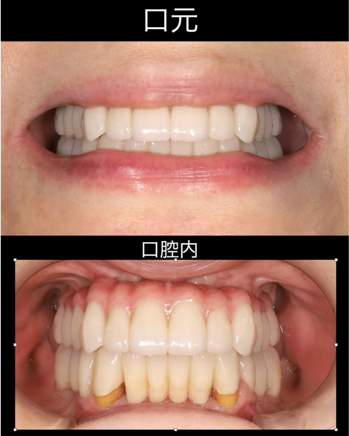 奥歯のインプラントがしっかりと噛む力を支え、前歯は残っている天然の歯を利用してセラミックで美しく修復しました。結果、見た目にも自然で、機能的にも安定した『理想的な咬合(こうごう)』を実現。