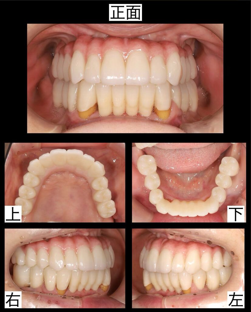 下の歯は、奥歯にインプラントを埋入し、前歯は残せる歯を活かしてブリッジで連結。