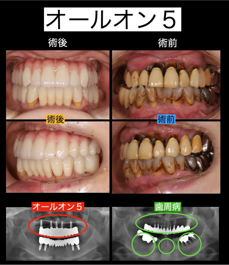 | 治療内容 | 上顎オールオン5本 下4本のインプラント治療 |