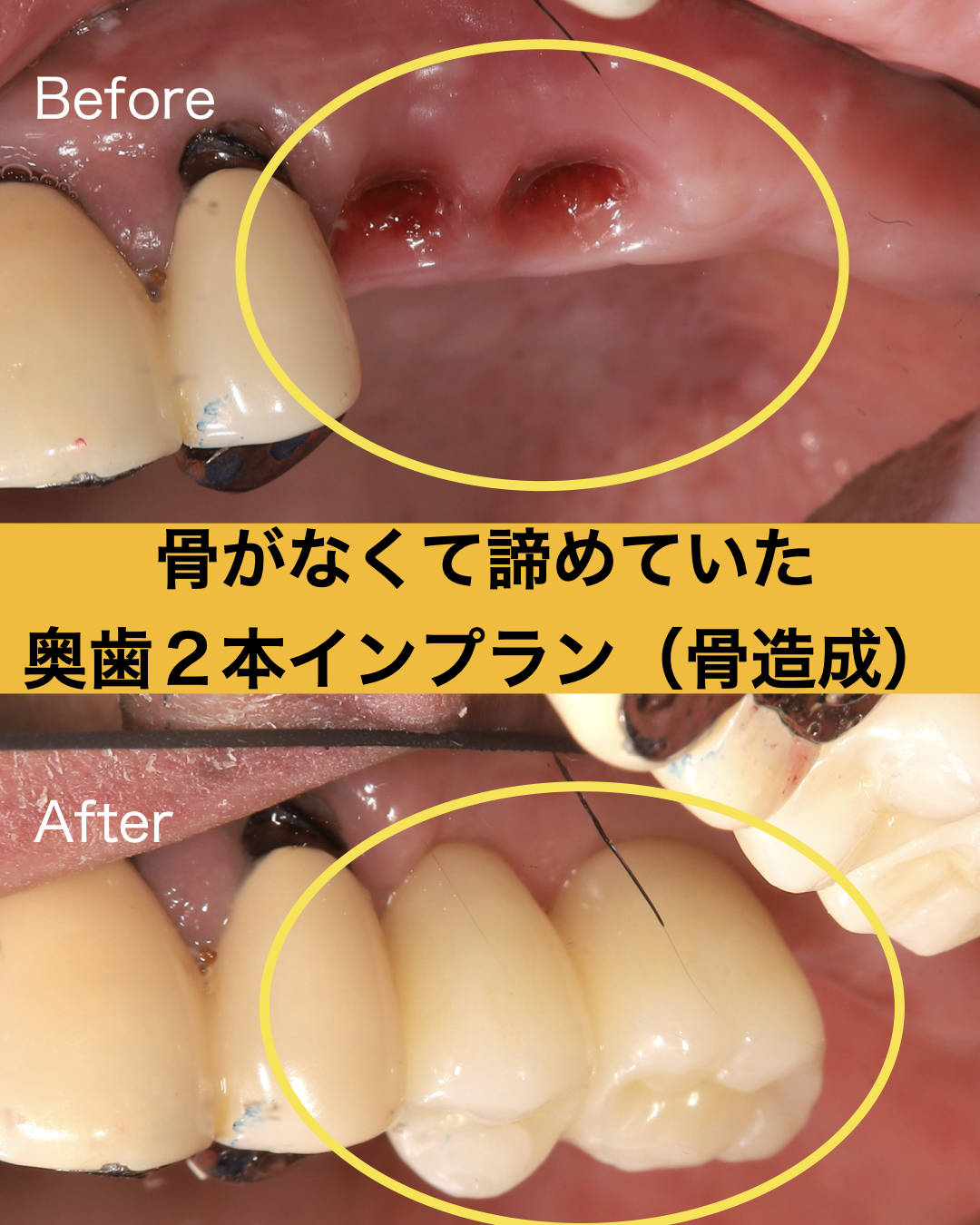ご本人はインプラントをしたかったそうですが、骨がないので、他院では入れ歯しかないと言われ我慢していました。