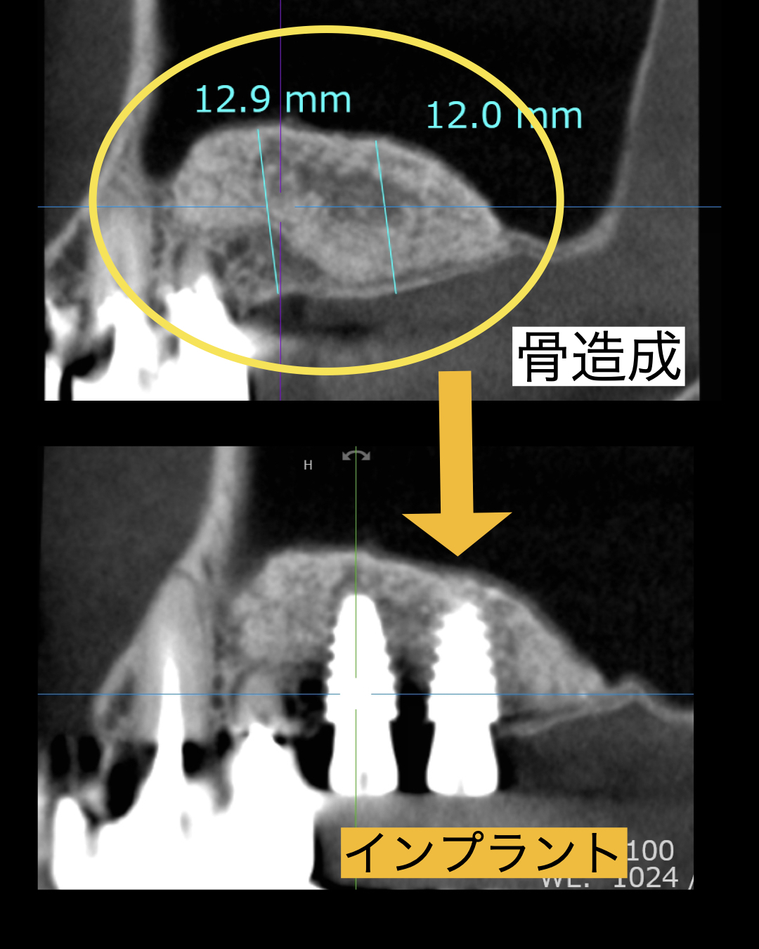 CT撮影を行い、審査診断の結果たしかに骨は1ミリほどしかなく、そのままではインプラントはできない状態でしたが、骨造成のお話させて頂き、骨を造ればインプラントができることをお伝えすると是非ともやりたいと患者様の同意を頂きました。