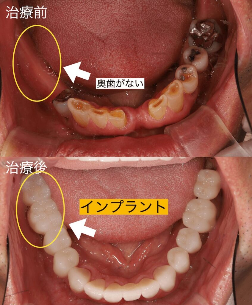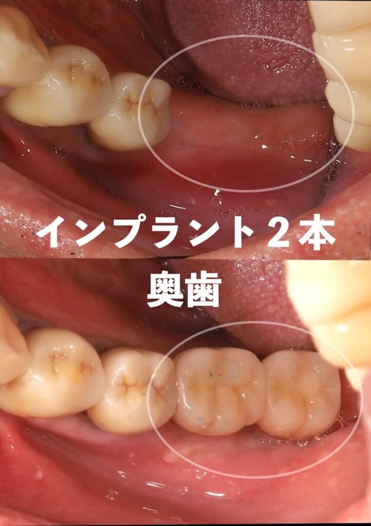 こちらの患者様は50代の頃から奥歯を失い、長年にわたり入れ歯で生活されていました。しかし、「もっとしっかり噛めるようになりたい」という強い思いから、現在のかかりつけ医に相談されたものの、その歯科医院ではインプラント治療を行っておらず、より噛める環境を求めて当院を受診されました。