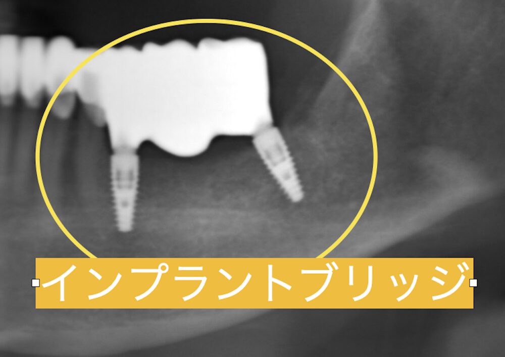 奥歯を3本以上失った場合、インプラントをすべての部位に入れると治療費が非常に高額になります。そのため、インプラント2本を支えにしてブリッジ構造で3〜4本を補う方法が選ばれるケースがあります。