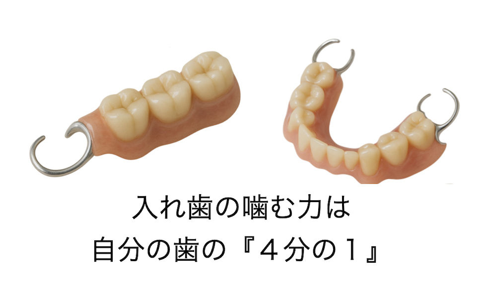 歯を失う時は奥歯から失うことが多く、奥歯が入れ歯で噛みにくいと感じる方は大勢いらっしゃいます。入れ歯は自分の歯やインプラントに比べて噛む力は4分の1程度になるので噛みにくいと感じる事のは当然だと思われます。